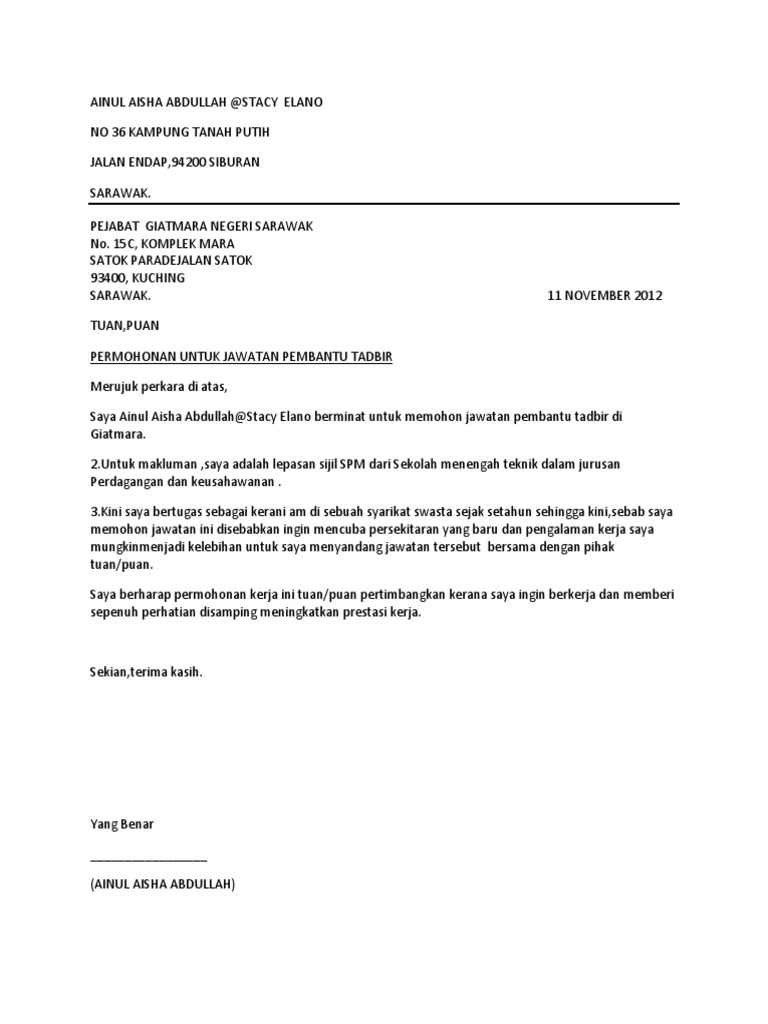 Versi Bahasa Inggeris Contoh1 Contoh 2 Contoh 3 Contoh 4 Contoh 5 Versi Bahasa. Buat masa ini saya menggalas jawatan sebagai pembantu tadbir di kulim sdn bhd sebuah syarikat swasta yang. Contoh Surat Permohonan Kerja Kosong Mudah 2021.