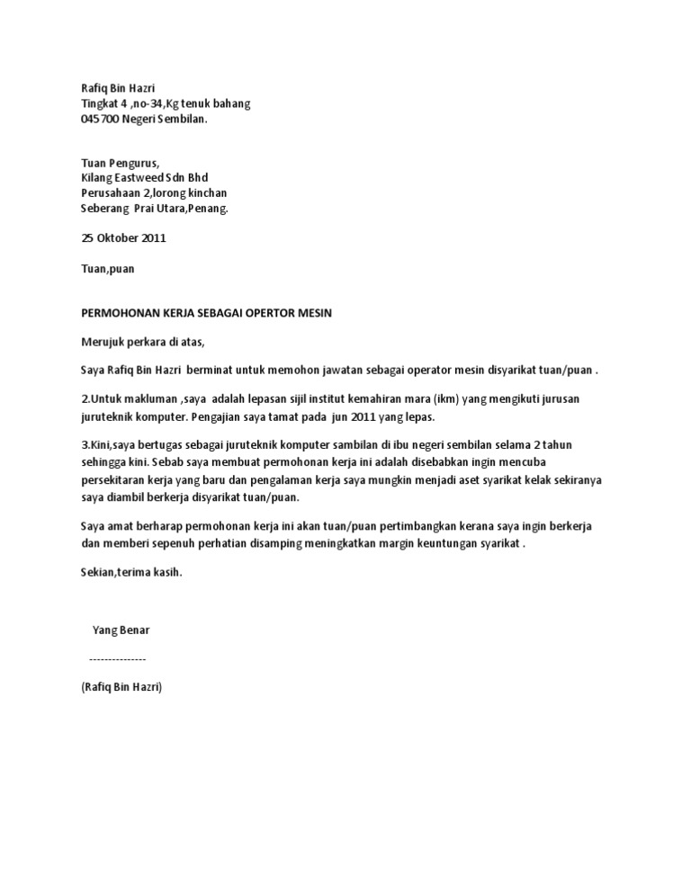 Sekiranya anda menyebut lebih daripada satu kejadian bahagikannya kepada 2 perenggan berbeza dan. Contoh surat permohonan kerja kilang have a graphic from the othercontoh surat permohonan kerja kilang it also will feature a picture of a kind that could be seen in the gallery of contoh. Surat pemberitahuan ini biasanya berisi tentang informasi yang ingin.